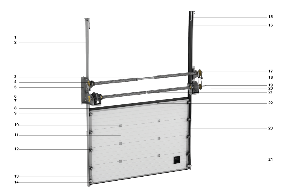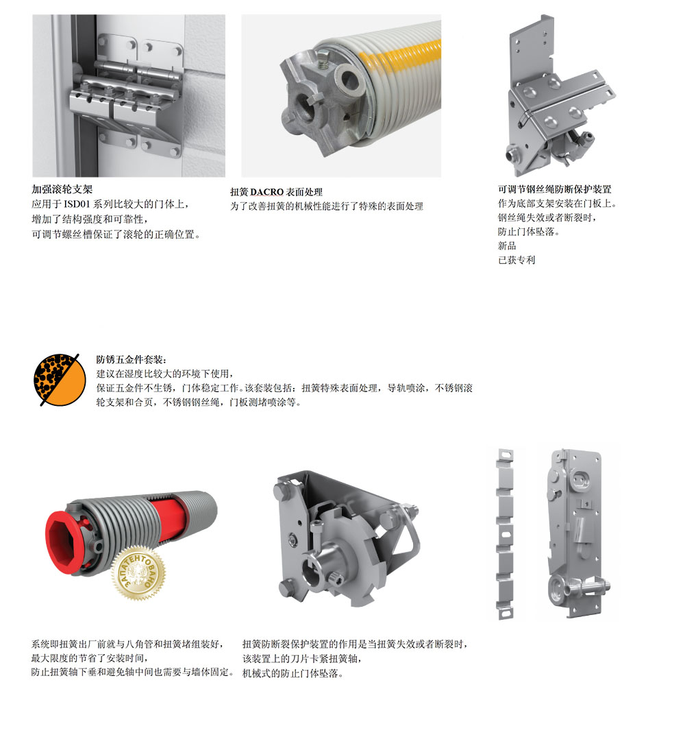 安全装置包括:扭簧防断裂保护装置和钢丝绳防断保护装置,防止门体意外坠落。